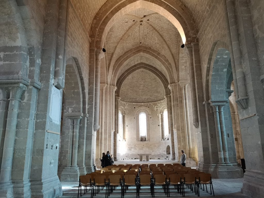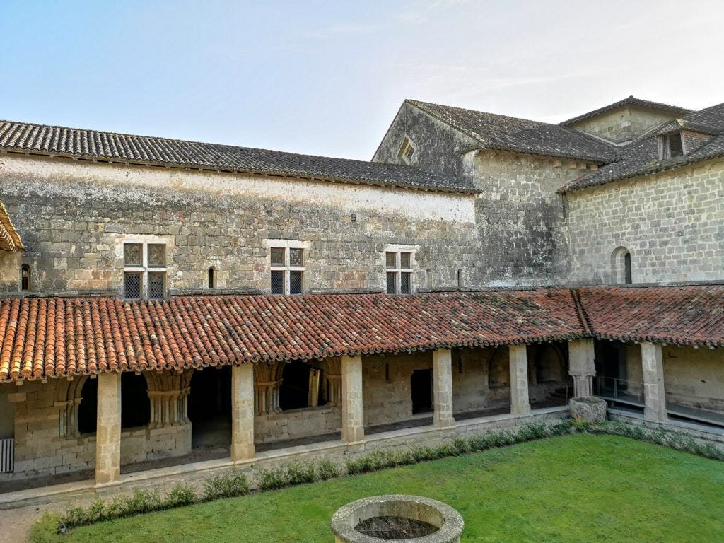 The next morning, after a generous breakfast buffet that offered cereal, yogurt, cheese, and charcuterie (in addition to the typical French standards of bread-bread-bread-croissant), we set out on a hike. The main attraction in the region is the Flaran Abbey. It's a 12th-century Cistercian monastery that looks remarkably well-preserved. In fact, according to a poster inside, it seems that the monastery fell into private hands last century, and the son of the owner attempted to torch it as part of an insurance scam. After a public debate, the Gers Department bought it and restored it in the 1970s.