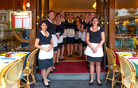 We braved the arctic winter for a family dinner at one of our favorite Paris restaurants, the Relais de l’Entrecôte. It is at once both very French and very not French. The waitresses — and yes it’s only waitresses — wear simple black dresses with white collars and aprons.