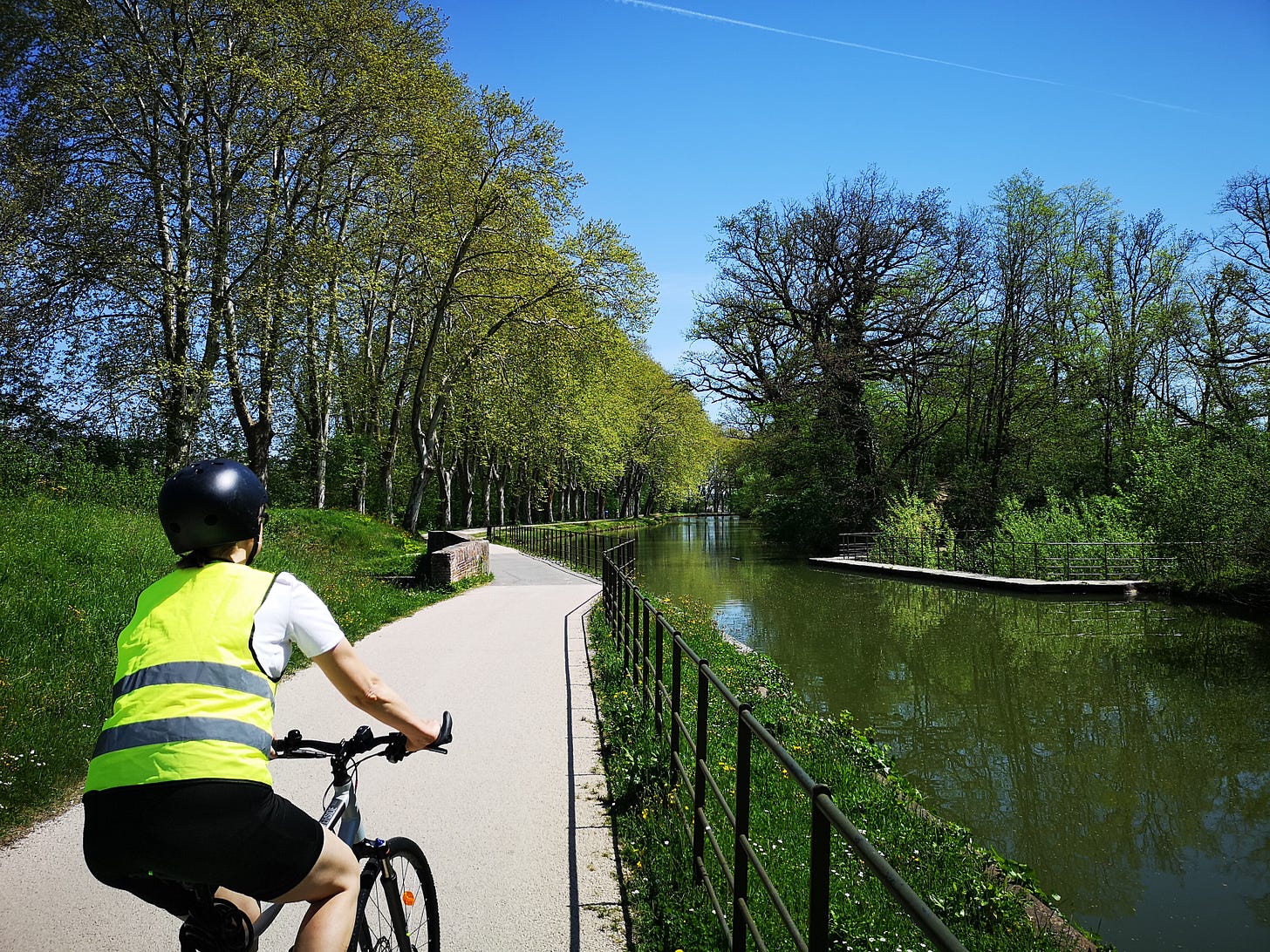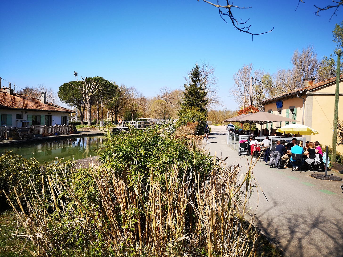 Turning southeast, the paved path ran along the right side of the canal. The canal’s reflective waters stretch about 60 feet across, met by sloping banks on each side. In Toulouse, the bike path that runs alongside has the feel of a festive city park. Parents pushing strollers, couples holding hands, and distracted singles walking their dogs while staring at their smartphones. Progress was slow as we zigzagged our way through the crowds while constantly ringing our bike bells, a task made awkward as we adjusted to the weight of the sacoches.