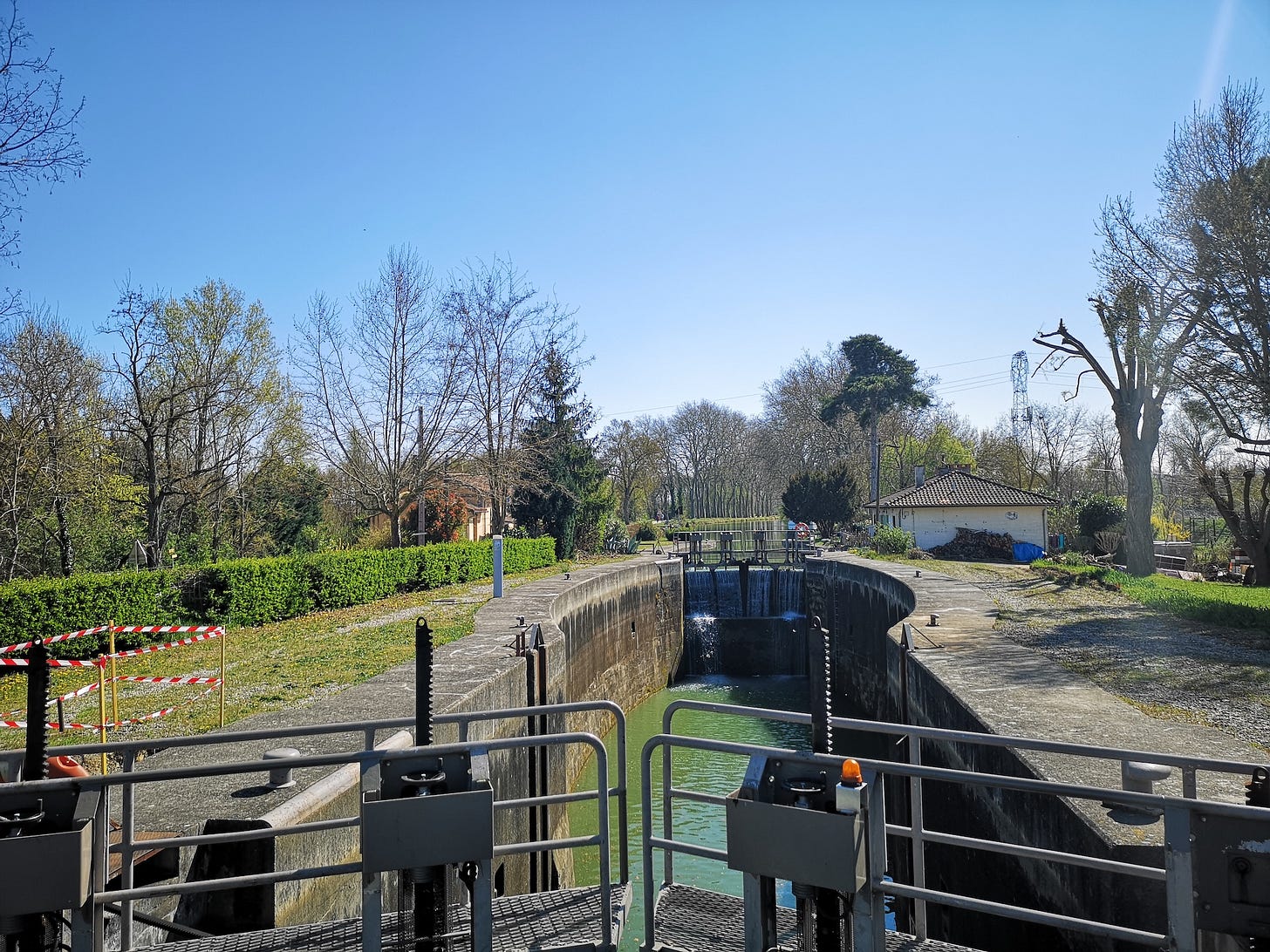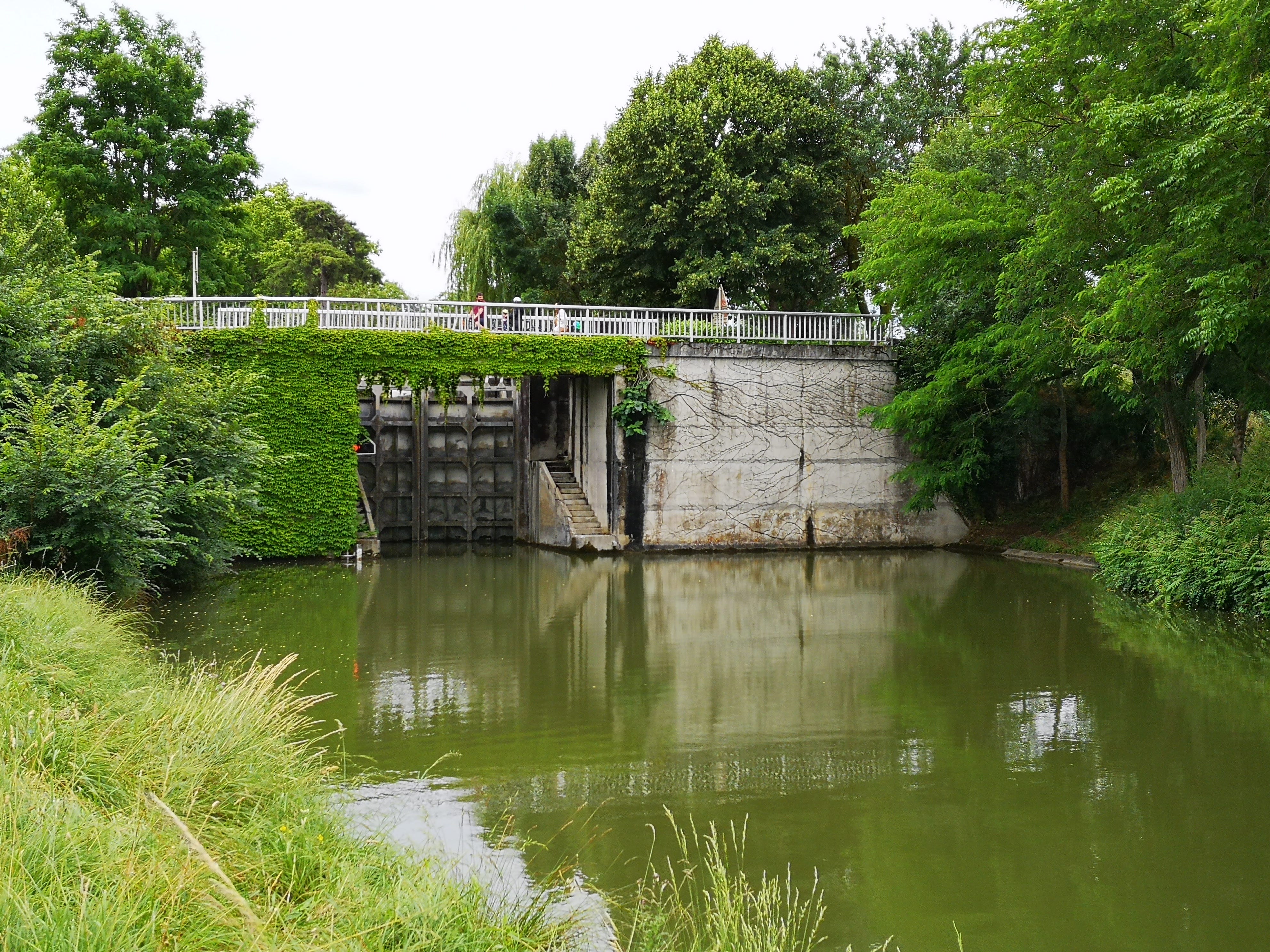 About 8 miles into the ride, we passed our first lock, the Écluse de Castanet. Two ivy-covered stone walls reached out from each bank toward the middle, where they supported two metal doors about 20 feet high. A red light signaled to boats traveling the same direction that the écluse was closed and filled with water to allow boats coming from the other direction to enter and descend. We climbed a short hill along the canal that brought us to the top of the écluse. On the other side of the metal doors, the stone walls bowed outward in the middle and then narrowed again around another set of doors.