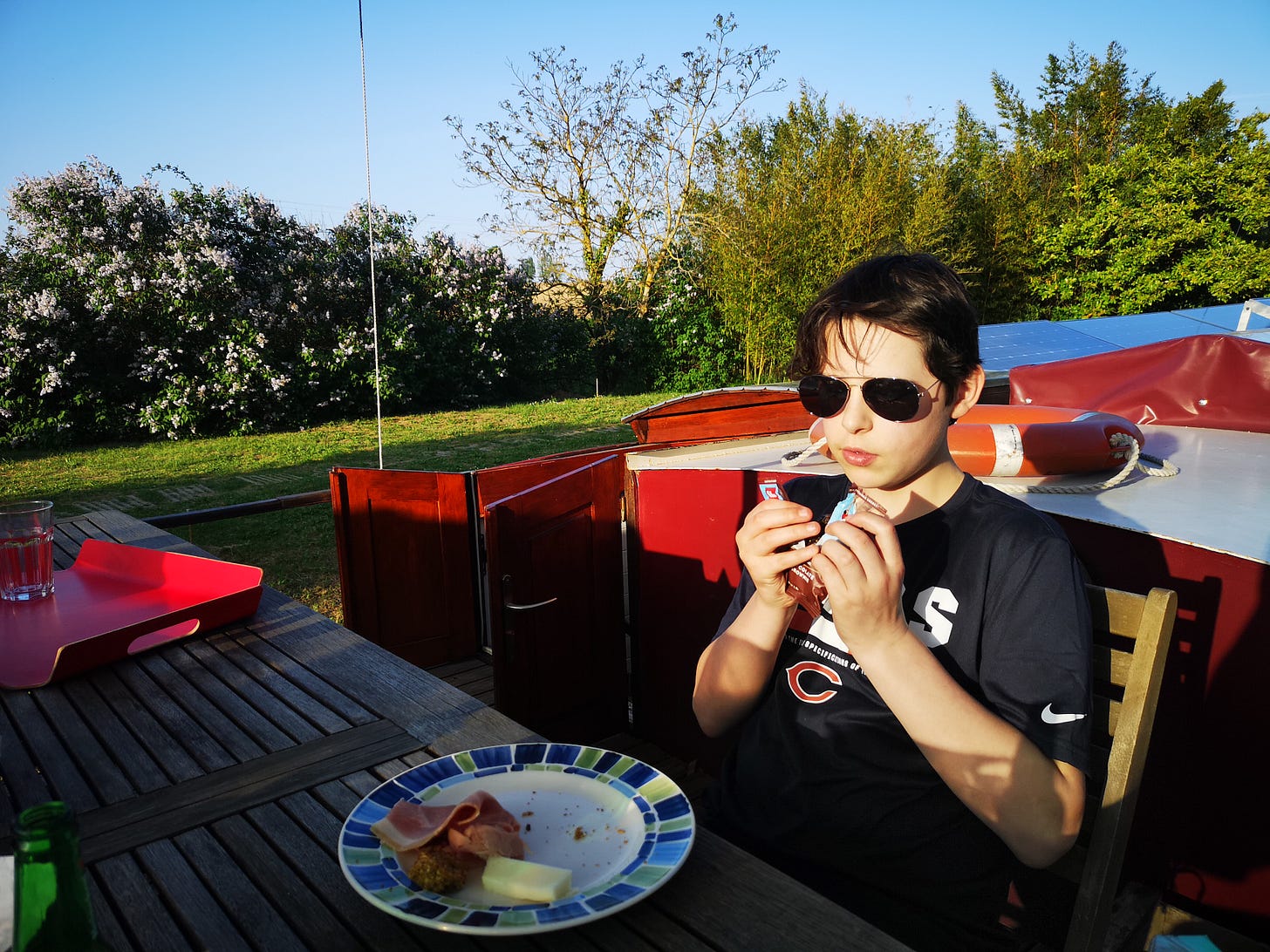 It was surprisingly spacious below deck, with one master bedroom for us that also had a shower and a slightly smaller 2-bed room adjacent to ours for the kids. After relaxing for a bit, we climbed back on deck at a table where we made an improvised dinner of the last of our provisions, including some cheese, ham, baguette, avocado, tomatoes, and Cliff Bars for dessert. Hardly the meal of kings, but we had worked hard for it and savored every bite as the sun set and applauded ourselves for having successfully navigated the first day.