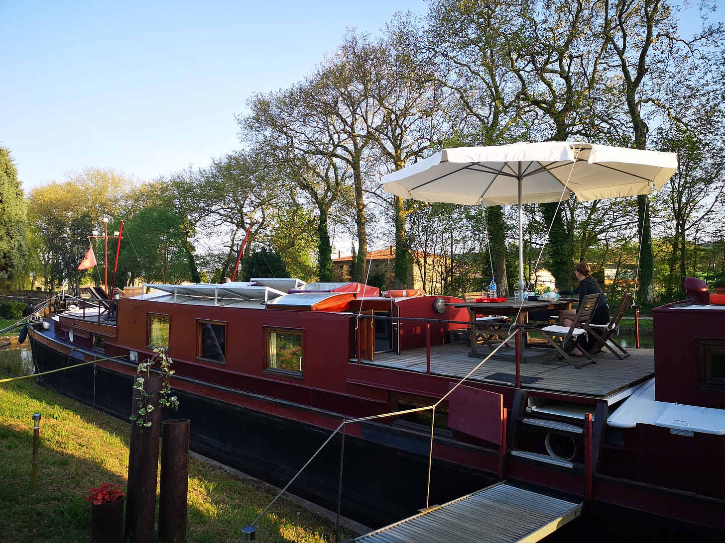 After about 5 hours of riding, we arrived at our hotel for the evening, a péniche called Kapadokya. Almost 100 feet long and 15 feet wide, the boat was built in Belgium back in 1939 and passed through several hands before being purchased by the current owners, Mado and Patrick Isaac. The hull was painted deep black, with the sideboard of the deck and a terrace painted a striking red, and sporting a large red and gold Occitanie flag over the bow. We crossed the canal on a small stone bridge to the other bank where the péniche was moored, locked our bikes, and were greeted by Mado, a short and energetic woman.