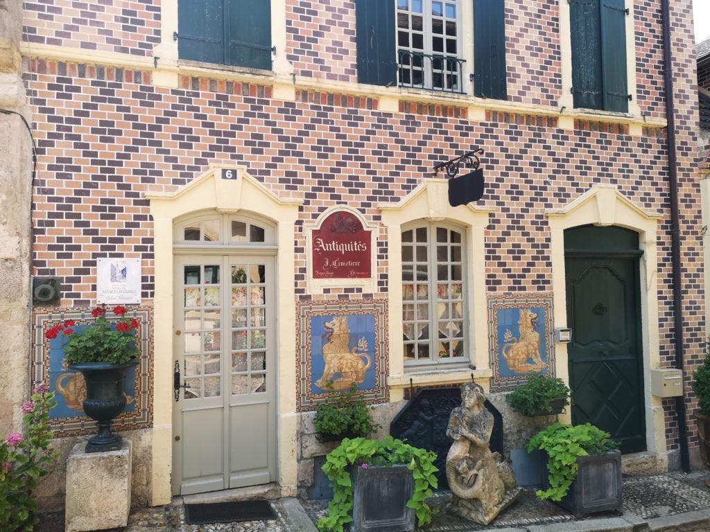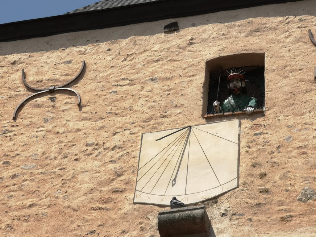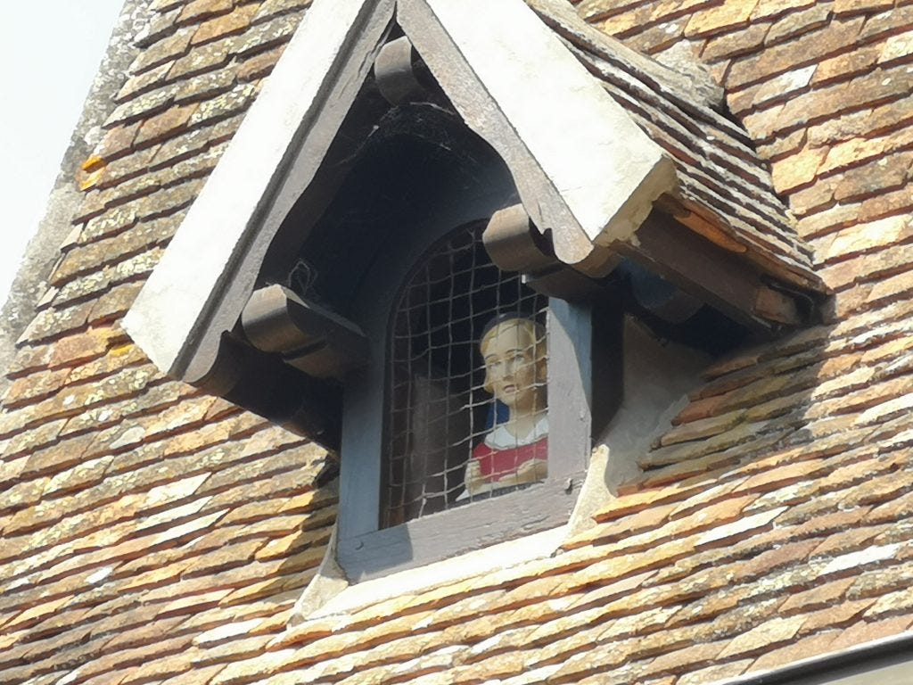 One enters through an arch under the clock tower, which apparently used to be the wooden-gated entrance to the city. (see photo above). If you look closely, just above the clock, there is a man in blue (photo below) called "Le Beurdin", an automated statue that rings the bell every hour and represents a kind of village idiot that has become the town's mascot. Indeed, the town has the "Brotherhood of Beurdin" which celebrates the bell ringer's "common sense, tolerance and humanism."