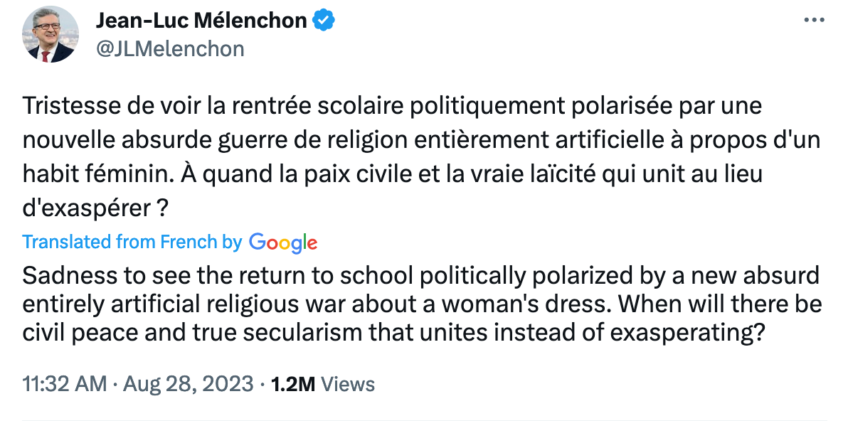 “Sad to see the return to school politically polarized by a new absurd entirely artificial religious war about a woman's dress,” Mélenchon tweeted. “When will there be civil peace and true secularism that unites instead of exasperating?”
