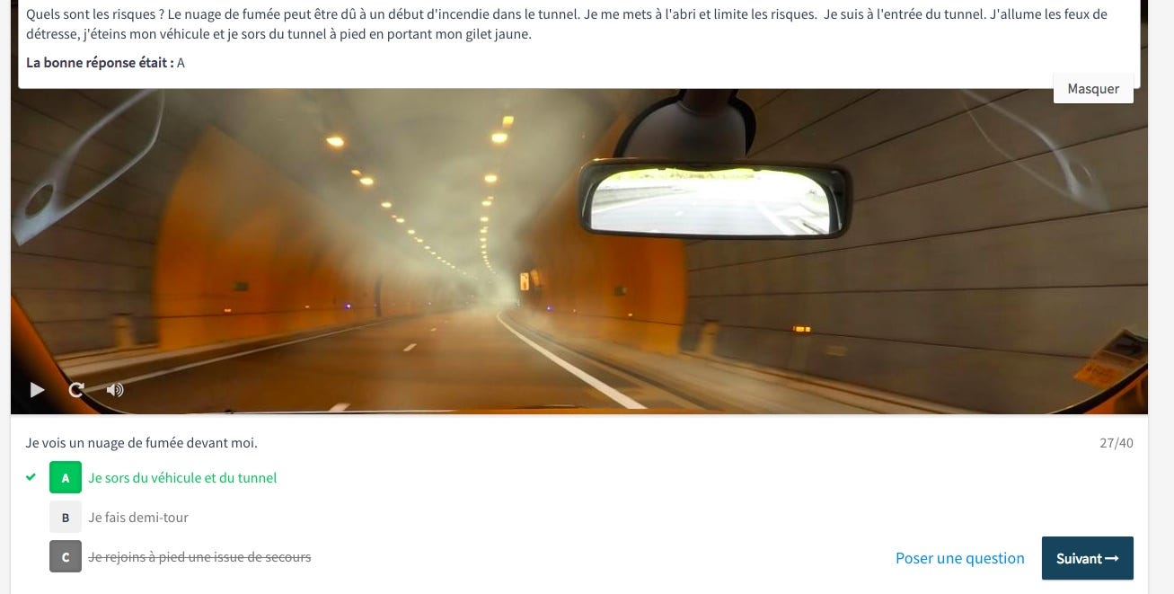 Some of them are just insanely tricky. In this example, you are asked what to do if you are driving in a tunnel and see smoke. One option is to leave your car and head to an emergency exit. But that is not the correct response. Why? Because if you notice in the rear view mirror, the driver has just entered the tunnel. So rather than rushing to an emergency exit, the correct response is to simply walk back out of the tunnel.