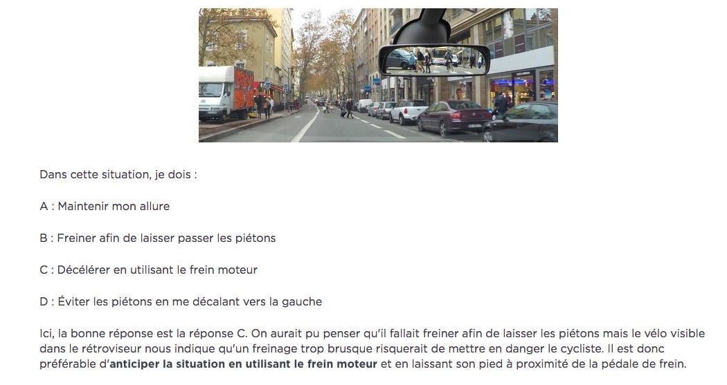 As I noted in The Local story, many of the questions on the written test are difficult because they are wholly subjective. The written test shows you 40 slides of photos taken from the driver’s perspective. Here’s the one I cited in The Local: