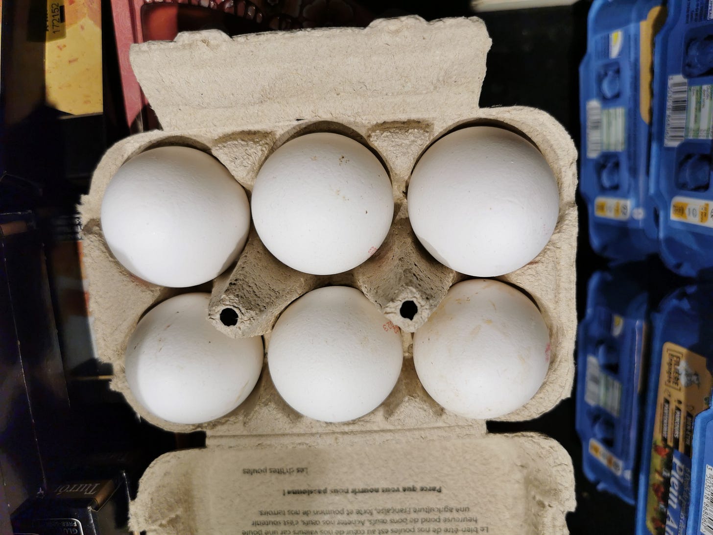 However, I made a note of these locations. And so taking a break from work last week, I drove to a nearby Auchan (generic French grocery store chain) that had them last year. I scanned the egg section and saw none. It’s always worth asking someone who works there because the logic of shelving in French stores is not always, well, logical. So I asked the man working in the egg section: Avez-vous des oeufs avec des coquilles blanches?