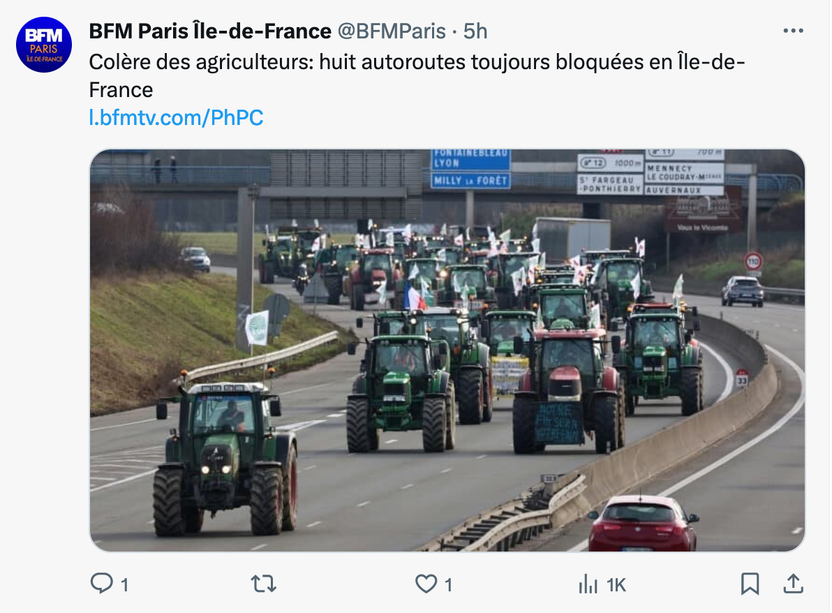 So on Monday, the tractors arrived and the blockades began around Paris, with at least 8 major roadways being shut down. The blockades are also happening around the country and in other EU countries. They are expected to last until Thursday when the EU is holding an agricultural-related session in Brussels. Protestors are saying they plan to take their blockades to Brussels next.