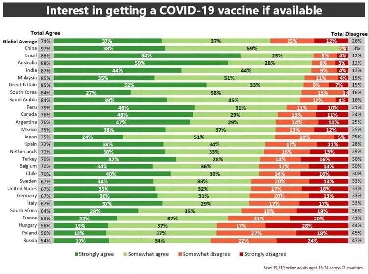 Overall, about three out of four adults around the world say they will get the vaccine, according to the World Economic Forum.