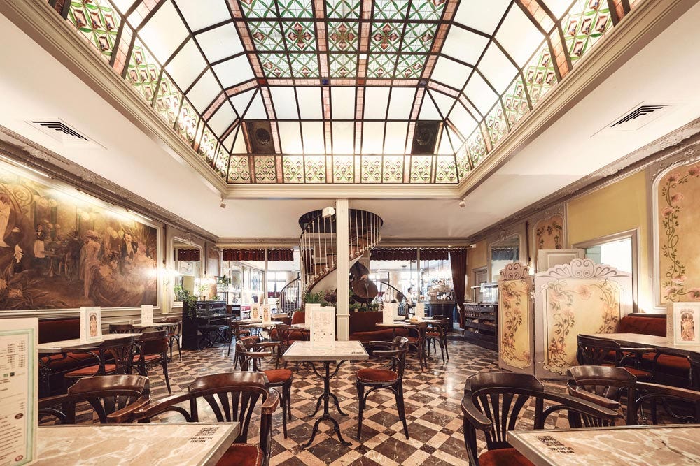 The interior is a lavish Belle Epoque affair, probably the fantasy of what most Americans expect in Paris but is a bit atypical for this city which has kept its Medieval look. A swirling staircase in the middle is surrounded by plush red velour seats and booths. A stained-glass ceiling and paintings of dandies and elegant women give the impression that not much has changed since the late 19th century.