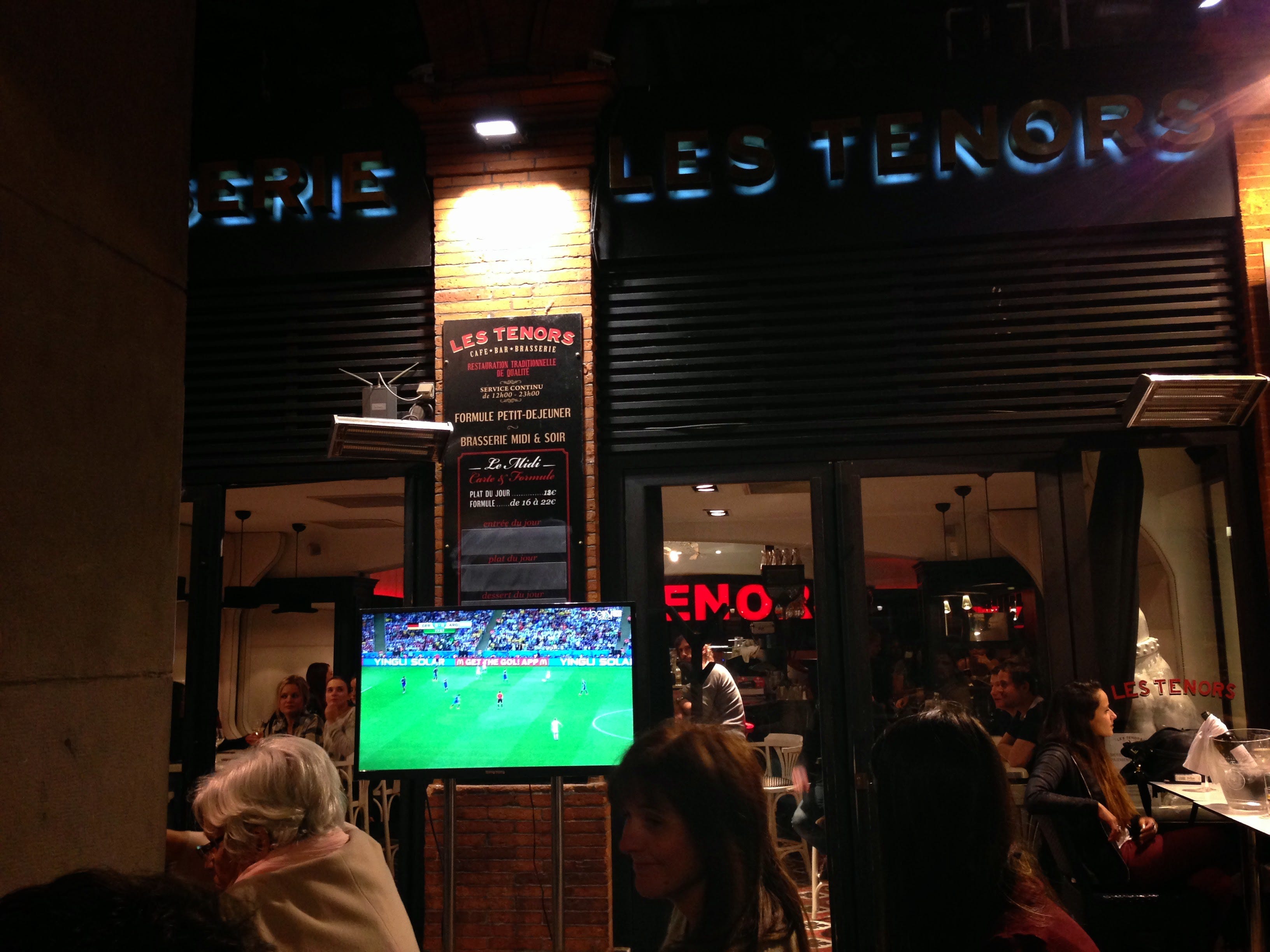 We opted instead for the terrace, where we managed to squeeze around a table to join hundreds of others watching the second half of the World Cup final on a TV perched above the waiters’ station at the neighboring bar.