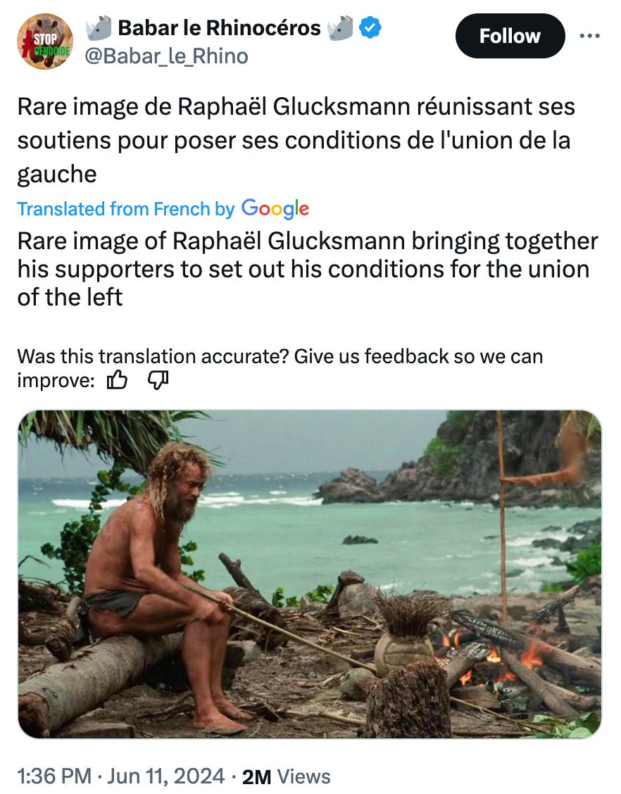 But then, Raphael Glucksmann, the dude who was the lead candidate of the Socialist Party for the EU elections, tried to torpedo the alliance by announcing a list of conditions for joining it, a list of demands that every human proceeded to ignore. And so, Mr. Glucksmann became France’s new Mr. Irrelevant.
