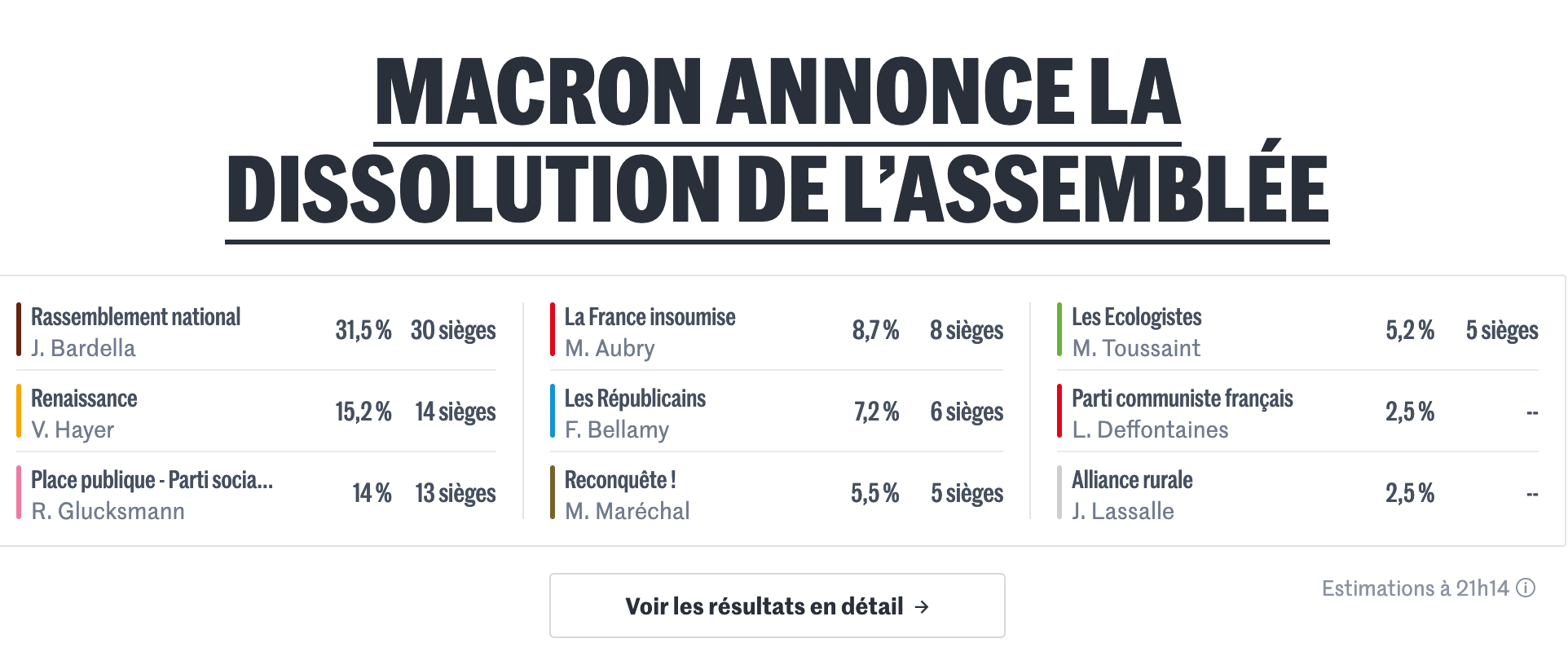 The unusual nature of the election and the blurry nature of alliances is making polling difficult. (French pollsters are historically quite accurate.) However, one early poll gave the RN the lead in voting intentions with 30%, the Popular Front in second with 25%, and Macron’s party in third with 20%.