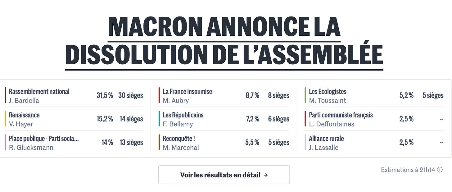 Yes, the European Parliament has some responsibility and the election results matter, kinda sorta. But, it is also the perfect place to register a protest vote, if one is so inclined. And the French are so inclined. They already poked Macron in the eye by re-electing him in 2022 and then denying his En Marche party an outright majority in the subsequent legislative elections. Despite a large list of positive economic indicators, his method of bulldozing reforms into law and his strategy of trying to undercut the rising far right by moving his formerly centrist party further to the right have managed to alienate just about everyone across the political spectrum.