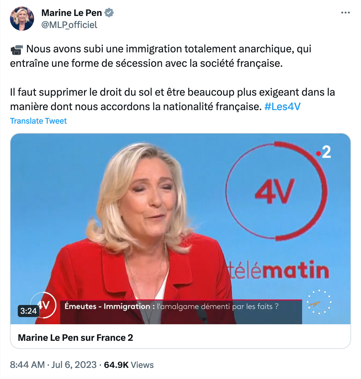 “We have suffered a totally anarchic immigration, which leads to a form of secession from French society,” Marine Le Pen lamented. "We must abolish le droit du sol and be much more demanding in the way we grant French nationality.” (le droit du sol = someone born in France, no matter their parents’ status, gets French citizenship.)